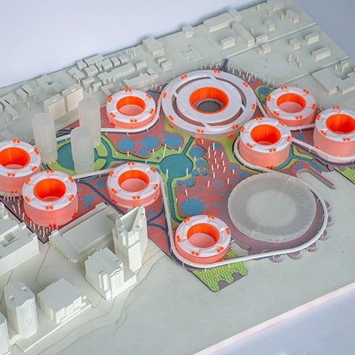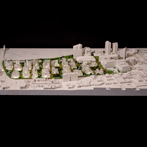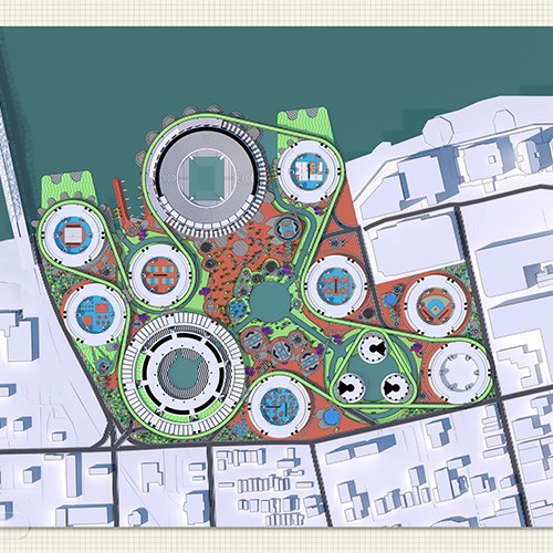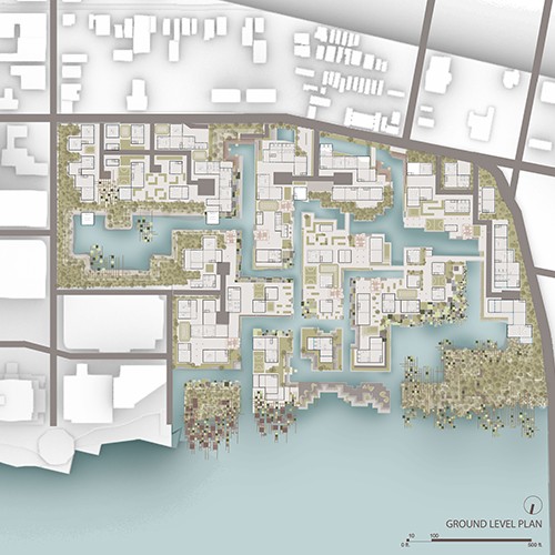 The Ohio River waterfront in Covington, Kentucky, which once operated as the city’s service yard for shipping, goods transfers and industry, is currently underutilized. A new zoning plan for the site will change what had been industrial warehouses associated with the waterfront into a mixed-use residential neighborhood. The site is straddled by concerns of water – stormwater flows into the site from the city on the south, while river floods swell into the site from the north. Our studio section specifically studies the potential of floodwater and stormwater management as a way of reorganizing an urbanism prioritizing streets to an urbanism prioritizing usable public space. In turn, new visions for riverfront living emerge that might serve as models for the city at large.